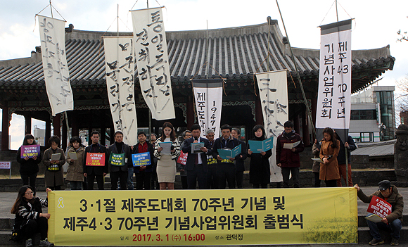 제주4·3 70주년을 1년 앞두고 ‘제주4·3 70주년 기념사업위원회‘는 지난 3월 1일 제주시 관덕정에서 ‘3·1절 제주도대회 70주년’ 기념 및 제주4·3 70주년 기념사업위원회 출범식을 가졌다. 이날 행사는 제주4·3의 도화선이 된 1947년 3·1절 제주도대회를 기념하는 거리굿 공연에 이어 출범식, 거리행진 순으로 진행됐다. 기념사업위는 제주주민자치연대 등 도내 65개 단체로 구성된 범도민기구이다.