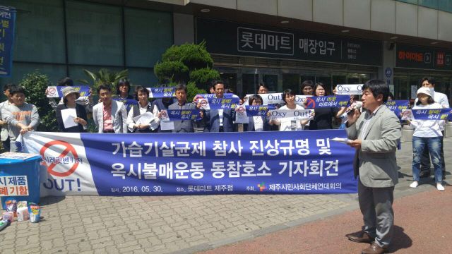 현재까지 266명의 목숨을 앗아간 사상 초유의 환경재난이 발생한 원인을 명백히 밝혀내고, 가장 많은 희생자가 발생했지만 책임떠넘기기에 급급한 옥시기업 제품에 대해 범도민적인 불매운동 동참을 호소하는 기자회견이, 지난 5월 30일 오후2시, 신제주롯데마트 앞에서 진행됐습니다.
